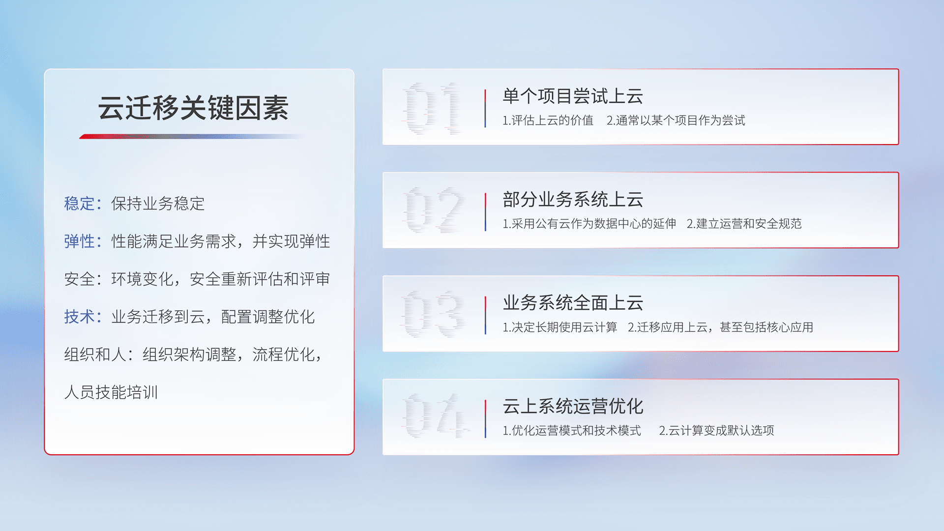 结合实际业务,,,从规划设计、、、云平台选型、、、、云原生改造、、、数据迁移、、集成交付,,,迁移全过程为客户识别最佳上云路径,,做好风险识别管理,,,设计网络架构、、、、身份权限、、安全审计合规、、、操作审计、、、、日志审计、、、监控告警策略、、、、多站点容灾设计等,,对云上基础设施进行整体规划,,,,提升IT治理水平,,,,以满足弹性、、高可用、、、、高性能的需求。。。。