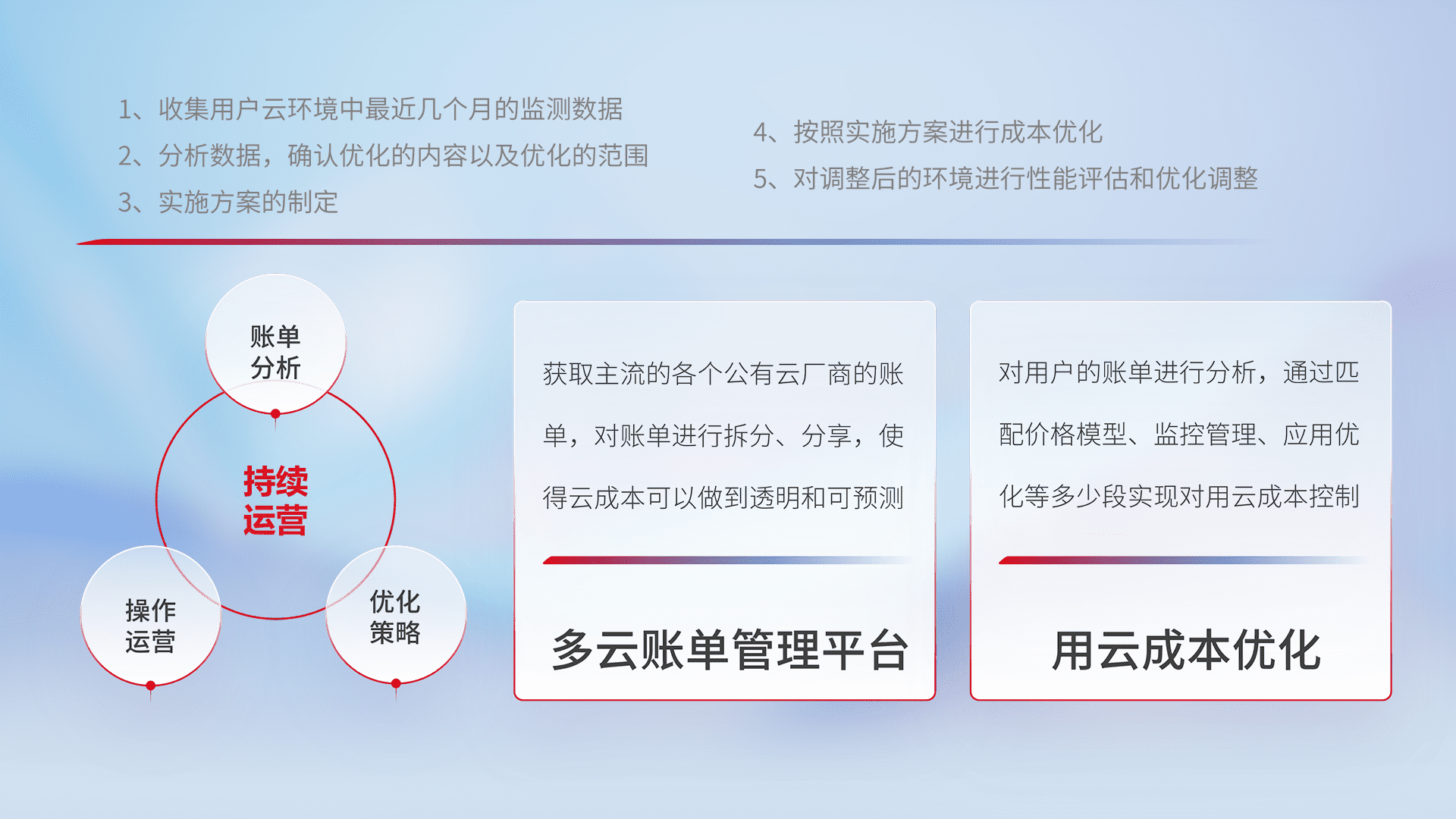 通过多云纳管,,,以统一的资源数据模型把客户的云资源进行抽象和封装,,,进而实现对多云资源的统一操作,,,保障云资源管理的可靠性、、、稳定性与可用性。。。量身定制化运维内容,,,,配置、、开发运维、、、补丁管理、、、、备份、、、监控、、认证和访问管理、、审计和日常巡检等,,保障在用云过程中的可靠度,,,,稳定度以及高可用率。。